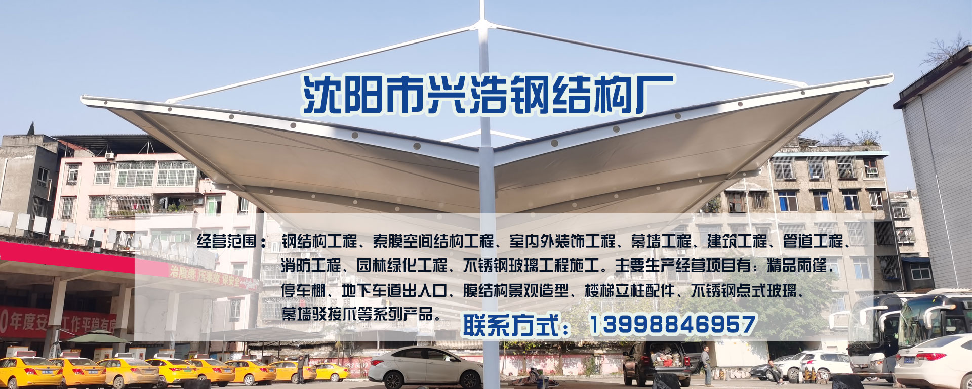 沈陽興浩鋼構是集研發、設計、生產、銷售、安裝服務于一體的綜合性鋼結構公司。經營范圍:鋼結構工程、索膜空間結構工程、室內外裝飾工程、幕墻工程、建筑工程、管道工程、消防工程、園林綠化工程、不銹鋼玻璃工程施工。主要生產經營項目有:精品雨篷,停車棚、地下車道出入口、膜結構景觀造型、樓梯立柱配件、不銹鋼點式玻璃幕墻駁接爪等系列產品。興浩公司在發展中創新,在創新中發展!先進、高效、嚴謹的管理模式,精良的生產設備,雄厚的技術力量,確保了我們能準時生產制造出優質的產品;高素質的商務團隊,完善的營銷網絡,確保了我們為客戶提···...
